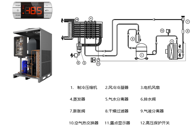 为保证压力露点,需要选择处理量为12m³/min冷干机来满足实际工况需求。
