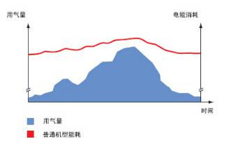 ● 在用气负荷高时压缩机加载,负荷低时压缩机卸载,由于存在空气需求量的波动,压缩机有较长时间处于卸载状态,导致能源的浪费